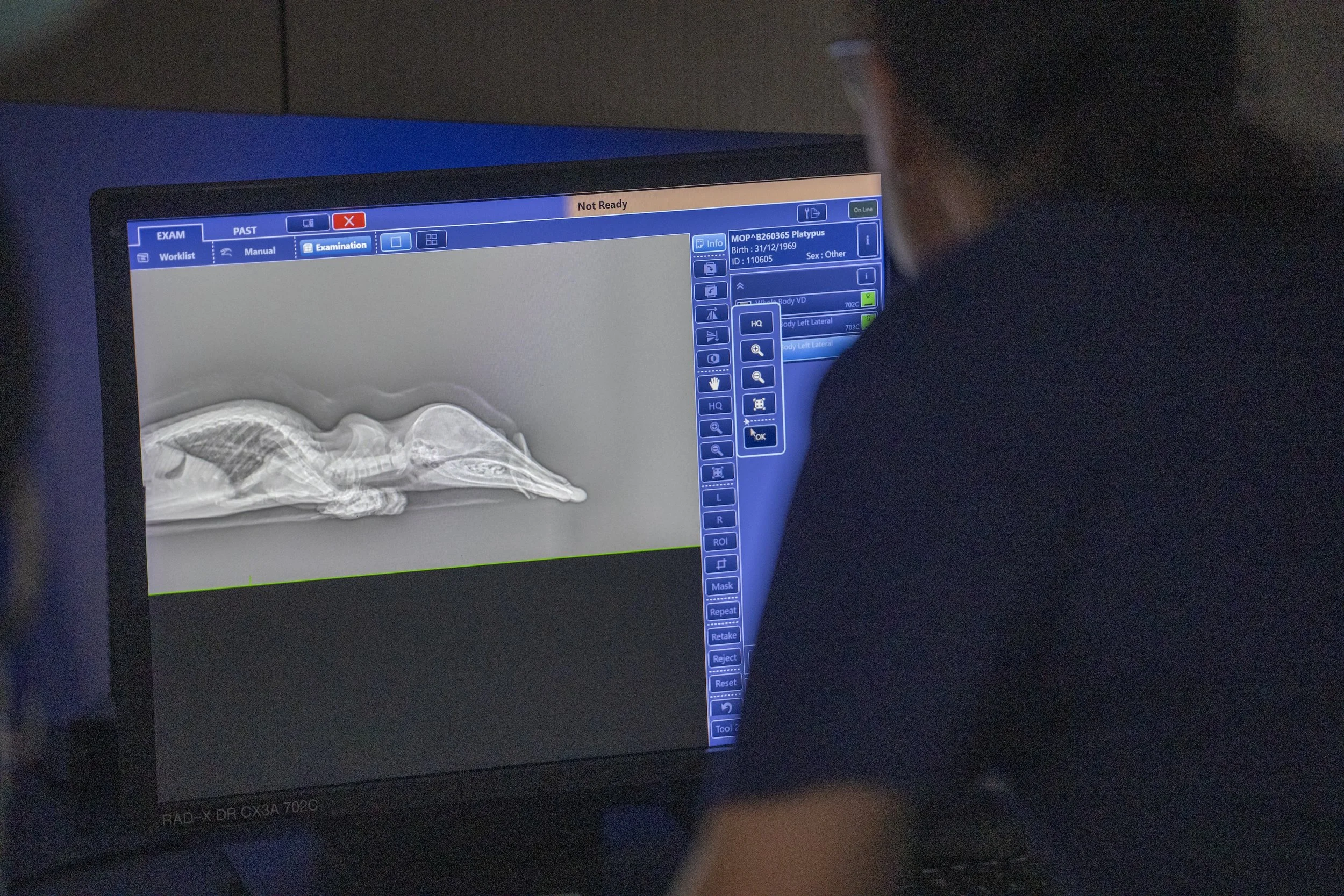 Dr Jackie Reed inspects x-ray imaging of the platypus patient. Photo Craig Parry Photography.